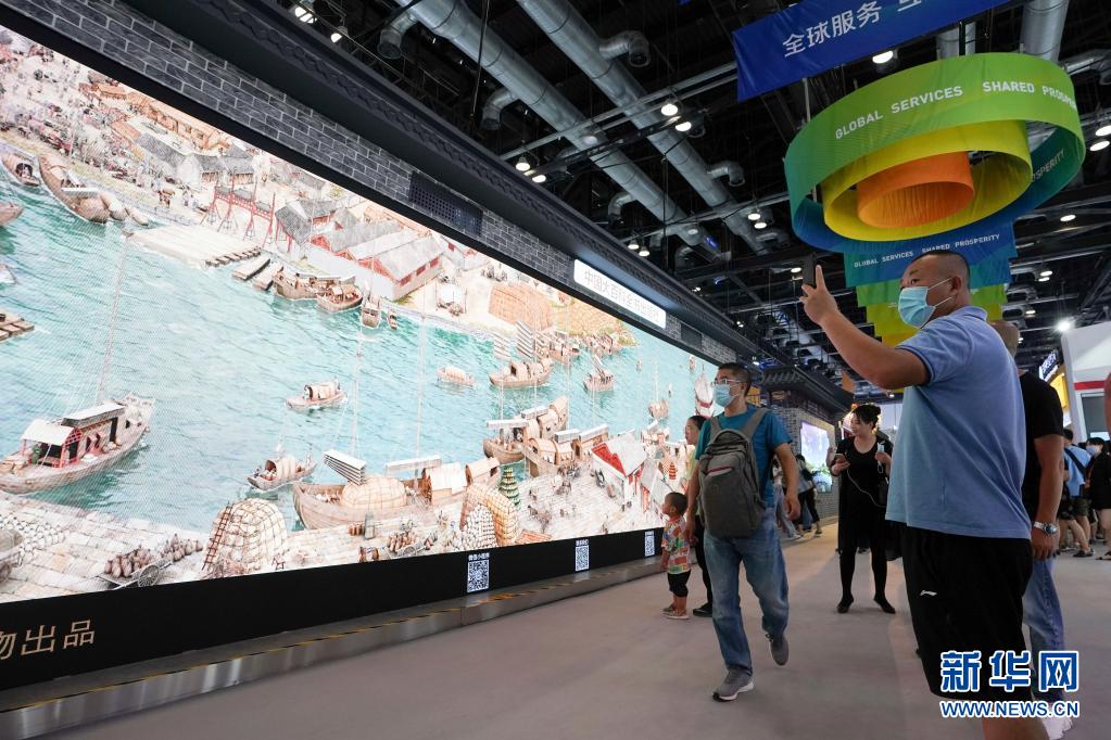 在2020年中國國際服務(wù)貿(mào)易交易會綜合展區(qū),參觀者在參觀展出的《穿越時空的大運(yùn)河》數(shù)字影像(2020年9月6日攝)。新華社記者 鞠煥宗 攝