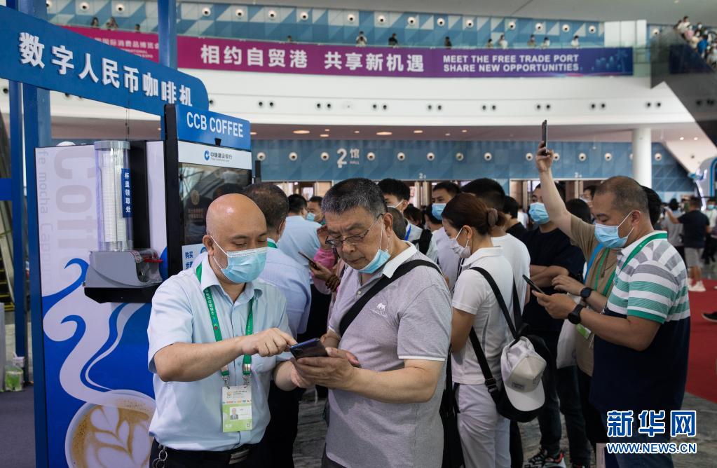 在?谂e行的首屆中國國際消費(fèi)品博覽會上,參觀者體驗(yàn)數(shù)字人民幣咖啡機(jī)(2021年5月10日攝)。新華社記者 金立旺 攝