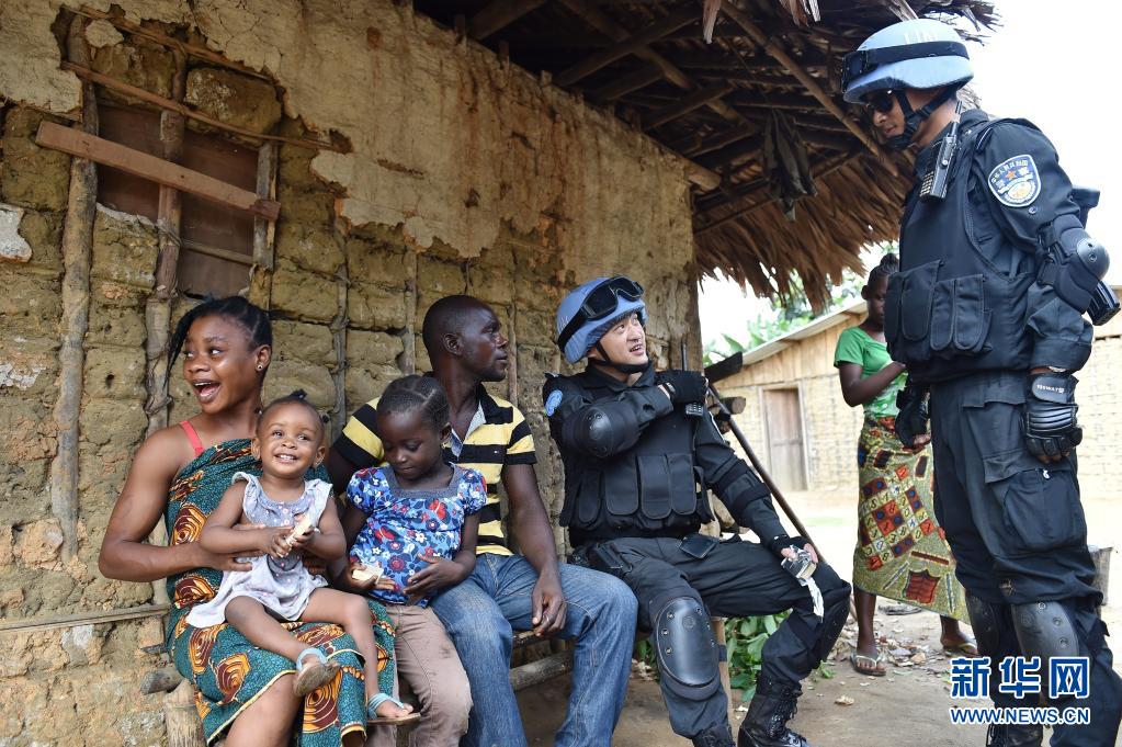 中國維和警察防暴隊(duì)隊(duì)員在利比里亞格林維爾的一座村莊詢問當(dāng)?shù)刂伟驳惹闆r(2015年11月3日攝)。新華社記者 孫瑞博 攝