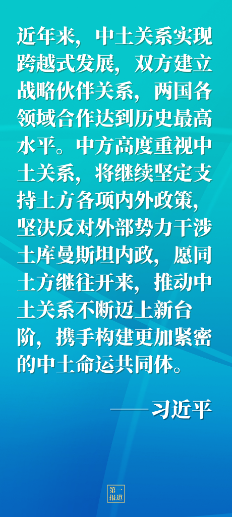 習(xí)近平指出,近年來,中土關(guān)系實現(xiàn)跨越式發(fā)展,雙方建立戰(zhàn)略伙伴關(guān)系,兩國各領(lǐng)域合作達到歷史最高水平。中方高度重視中土關(guān)系,將繼續(xù)堅定支持土方各項內(nèi)外政策,堅決反對外部勢力干涉土庫曼斯坦內(nèi)政,愿同土方繼往開來,推動中土關(guān)系不斷邁上新臺階,攜手構(gòu)建更加緊密的中土命運共同體。