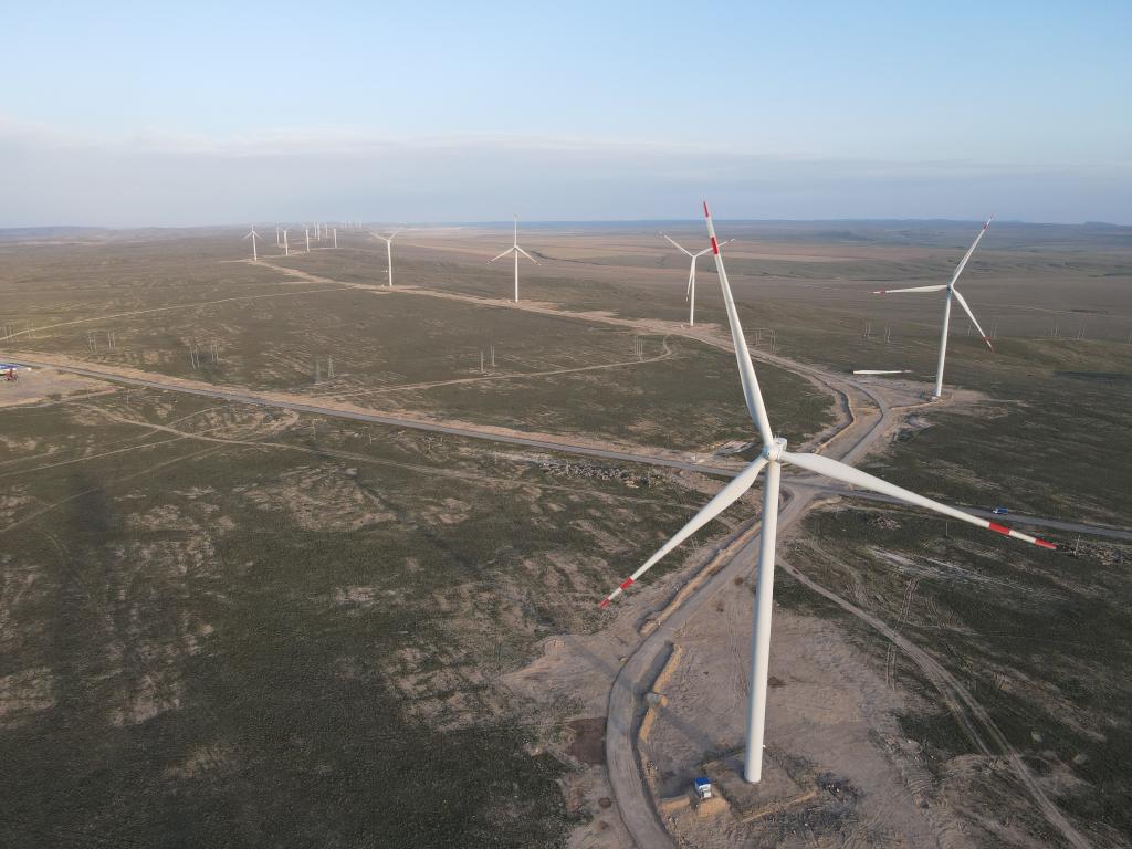2021年4月25日在哈薩克斯坦扎納塔斯用無人機航拍的風(fēng)電場的風(fēng)機。新華社發(fā)(中國電建成都院供圖)