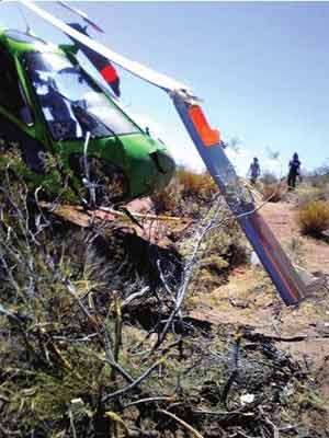 在第4賽段,央視的直升機(jī)對盧寧軍的賽車進(jìn)行跟蹤航拍,結(jié)果直升機(jī)在30米高空中突然出現(xiàn)故障,飛機(jī)呈自由落體墜地,當(dāng)時工作人員迅速上前解救,幫助航拍的記者逃離了飛機(jī)。 飛機(jī)墜地后,后翼和螺旋槳都已經(jīng)損壞,萬幸的是沒有人員傷亡。