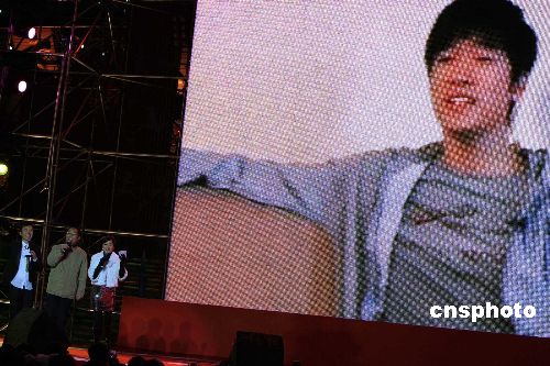 2008年的最后一個(gè)夜晚,劉翔的父親劉學(xué)根(左中)親臨在上海黃浦江畔舉行的可口可樂(lè)“暢爽開心年,新春齊分享”新年倒計(jì)時(shí)晚會(huì),并現(xiàn)場(chǎng)與遠(yuǎn)在美國(guó)療傷的劉翔一起,通過(guò)視頻,共唱新年快樂(lè)歌。中新社發(fā)潘索菲 攝