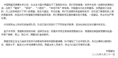 中國(guó)男籃亞錦賽失利之后,社會(huì)各方面對(duì)男籃給予了高度的關(guān)注,我們深表謝意!但其中也有一些媒體的猜測(cè)之說(shuō),出現(xiàn)了“賭球”、“做球”、“小團(tuán)體”、“將帥不和”等傳聞。中國(guó)籃協(xié)對(duì)此非常重視,在男籃進(jìn)行總結(jié)時(shí),對(duì)上述傳聞進(jìn)行了深入的調(diào)查,經(jīng)各方查證,并無(wú)此事。我們歡迎媒體的監(jiān)督和批評(píng),也歡迎了解情況的人提供調(diào)查線索,但堅(jiān)決反對(duì)傳播毫無(wú)根據(jù)的虛假消息,我們?cè)敢饩陀凶C據(jù)的事實(shí)進(jìn)行調(diào)查,一經(jīng)查證,將會(huì)作出嚴(yán)肅處理。