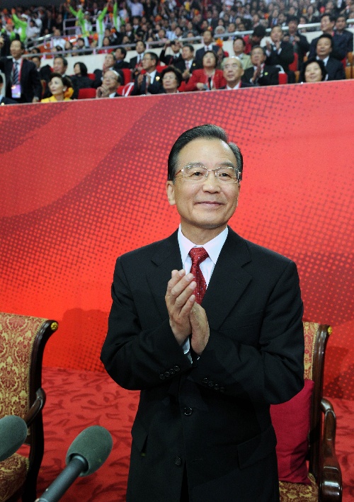 19時58分,在歡快的樂曲聲中,溫家寶和艾哈邁德等中外貴賓走上主席臺,向觀眾揮手致意。全場響起長時間的熱烈掌聲。