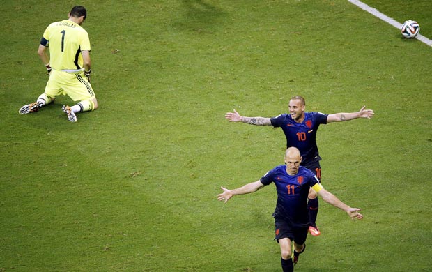 北京時(shí)間6月14日凌晨3點(diǎn),2014年巴西世界杯B組第一輪迎來第一場比賽。在薩爾瓦多的馮特諾瓦球場,上屆冠軍西班牙1比5不敵上屆亞軍荷蘭,斗牛士軍團(tuán)成為世界杯歷史上開局最差的衛(wèi)冕冠軍。這也是西班牙在世界杯史上第二大比分潰敗,最慘紀(jì)錄為1950年時(shí)1比6不敵巴西。哈維-阿隆索用一個(gè)爭議點(diǎn)球打破僵局,荷蘭連進(jìn)五球上演大逆轉(zhuǎn)。范佩西和羅本均梅開二度,中衛(wèi)德弗里也有一球進(jìn)賬,范佩西還曾射中一次橫梁。
