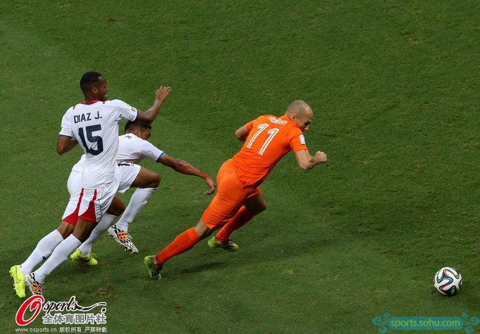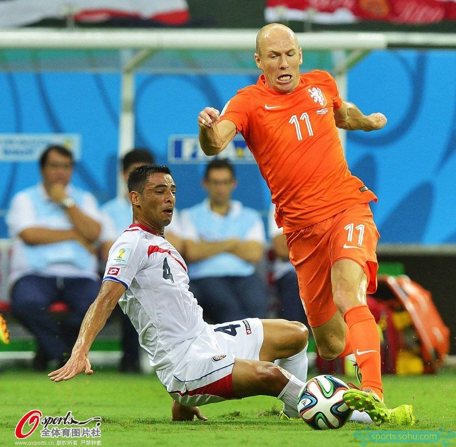 上半時開場,荷蘭隊便在控球方面占據(jù)明顯優(yōu)勢,哥斯達黎加隊在做好防守的同時堅持打快速反擊。由于荷蘭隊前場站位相對較死,而哥斯達黎加隊布防嚴密,因此前20分鐘荷蘭隊雖然場面占優(yōu)但卻無法贏得實質(zhì)性優(yōu)勢,哥斯達黎加隊幾次反擊雖然完成了邊路傳中,但都被荷蘭隊中衛(wèi)輕松化解。第21分鐘,德佩接庫伊特右邊路傳球分到左側(cè),范佩西大禁區(qū)內(nèi)得球低射,被納瓦斯擋出,斯內(nèi)德攔截后20米外再射,納瓦斯一擋將球沒收。