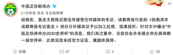 北京時間今天上午,國內(nèi)一家媒體刊登文章,稱里皮在接受該媒體特約記者采訪時稱,中國足球協(xié)會申辦2030年世界杯,這一消息隨即在足球圈以及相關(guān)范圍內(nèi)引發(fā)巨大關(guān)注,包括中體產(chǎn)業(yè)在內(nèi)的多支足球板塊相關(guān)股票大漲,雷曼股份更是直接封在漲停板上。而多家媒體隨后向中國足協(xié)求證此事,中國足協(xié)新聞辦負(fù)責(zé)人表示,“據(jù)協(xié)會了解,里皮近期未接受媒體專訪,這條新聞系加工而成”。
