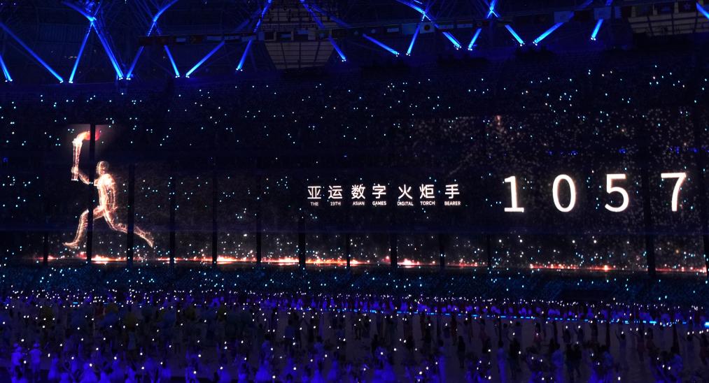 9月23日,“數(shù)字火炬手”在開(kāi)幕式上進(jìn)行火炬?zhèn)鬟f。新華社記者 杜宇 攝
