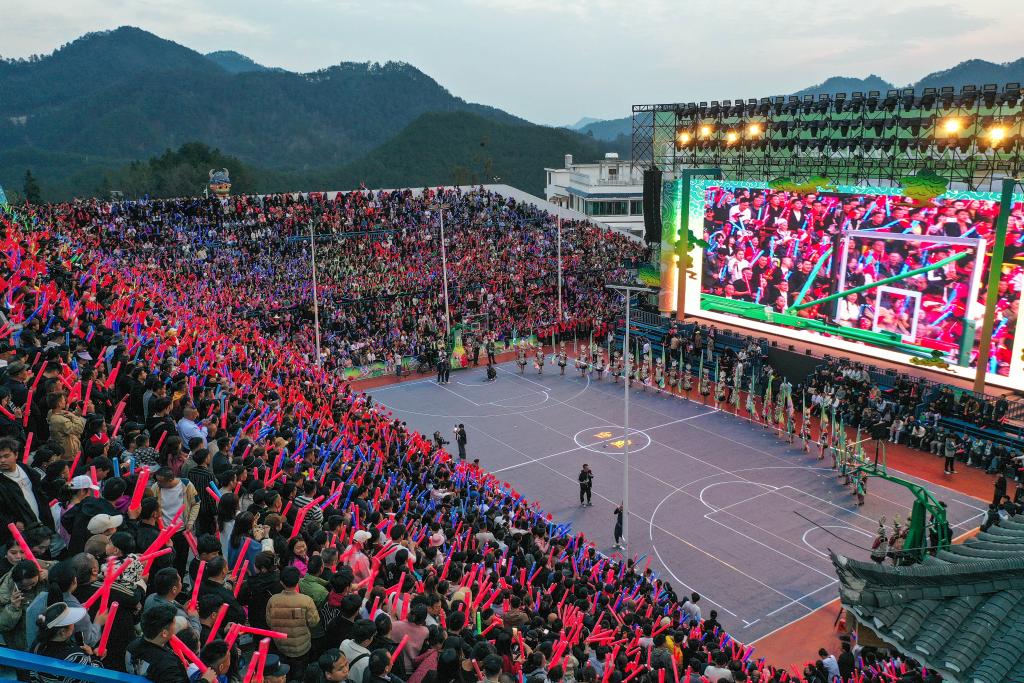 這是2024年3月22日拍攝的2024年鄉(xiāng)村籃球球王爭霸賽開幕式現場(無人機照片)。當日,以“活力四射 迎‘籃’而上”為主題的2024年鄉(xiāng)村籃球球王爭霸賽開幕式在貴州省黔東南苗族侗族自治州臺江縣臺盤村舉行。本次比賽將從3月持續(xù)到11月,是一次跨度長、范圍廣的全新賽事。新華社記者 楊文斌 攝