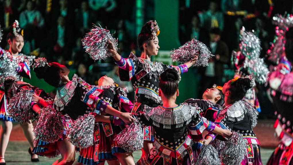 4月13日,演員在啟動儀式上進行歌舞表演。當日,大地流彩·2025年全國和美鄉(xiāng)村籃球大賽(村BA)啟動儀式在貴州省黔東南苗族侗族自治州臺江縣臺盤村舉行。新華社記者 陶亮 攝