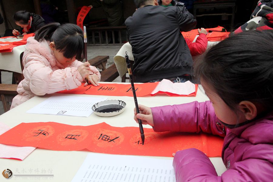 為了弘揚(yáng)中國優(yōu)秀傳統(tǒng)文化,營造喜慶、祥和的節(jié)日氣氛,2019年1月26日(農(nóng)歷臘月二十一)下午,天水民俗博物館特邀秦州區(qū)書法家協(xié)會、天水老子文化學(xué)會、天水書畫研究院等協(xié)會組織和公開招募的30多個家庭共同參加了“我為老宅寫春聯(lián)”活動,書法家陳安祥、張杰、趙治毅、謝勤定、雷鳴亞、李蘢、熊奇錄、張明道、董福元、能昌海、吳明文、汪月敏等和書法愛好者、青少年一同書寫春聯(lián)。