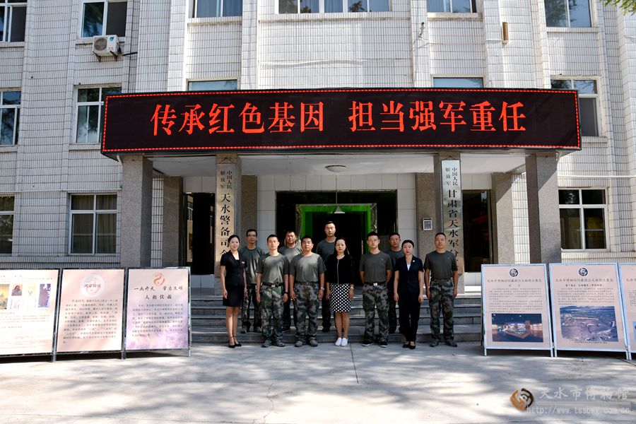 為紀(jì)念中國(guó)人民解放軍成立92周年,弘揚(yáng)擁軍愛民的光榮傳統(tǒng),鞏固雙擁建設(shè)成果,進(jìn)一步營(yíng)造軍地雙方團(tuán)結(jié)協(xié)作、攜手共建軍民魚水情的雙擁氛圍,8月1日上午天水市博物館接待服務(wù)部工作人員在部室主任杜麗敏的帶領(lǐng)下,帶著全市380萬兒女的深厚情誼來到天水軍分區(qū),結(jié)合《一畫開天 肇啟文明——人文始祖伏羲功績(jī)展》、《天水市博物館館藏精品文物展》等展板內(nèi)容開展送文化、進(jìn)軍營(yíng)“四進(jìn)”活動(dòng),在炎熱的夏日里為部隊(duì)官兵送去一份文化視聽盛宴,豐富廣大軍分區(qū)官兵的文化生活,進(jìn)一步加強(qiáng)了天水軍地文化融合,使伏羲文化走進(jìn)軍營(yíng)、深入兵心,見證了軍民一家親的魚水深情。