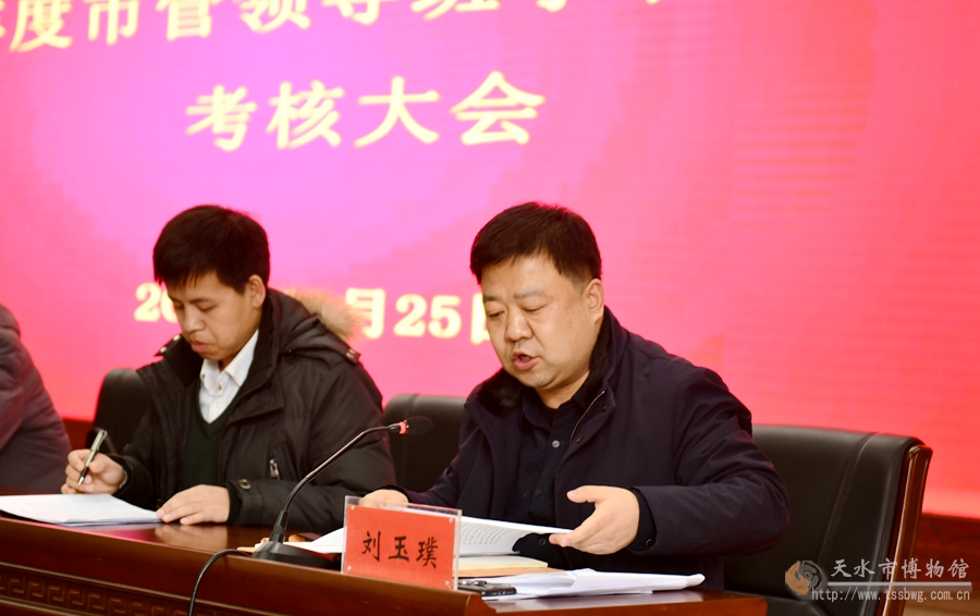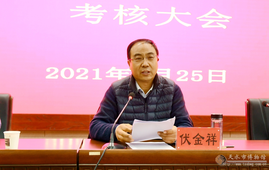 1月25日下午,天水市委第四考核組一行7人在組長(zhǎng)、二級(jí)巡視員伏金祥同志的帶領(lǐng)下,對(duì)市博物館2020年度市管領(lǐng)導(dǎo)班子和領(lǐng)導(dǎo)干部進(jìn)行了考核。市博物館領(lǐng)導(dǎo)班子成員和干部職工80多人參加了考核大會(huì)。會(huì)議由博物館黨總支書記、館長(zhǎng)劉玉璞主持。