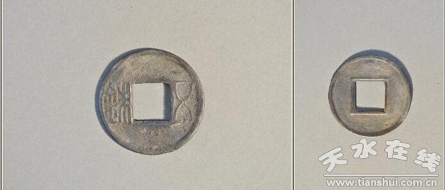 天水市博物館館藏的這枚西漢五銖錢文嚴(yán)謹(jǐn)規(guī)矩,小篆,“五銖”二字修長秀麗,“五”字交筆緩曲,上下與兩橫筆交接處略向內(nèi)收。五銖錢“銖”字“金”頭為箭鏃形,四點(diǎn)方形較短。“朱”字頭方折,下垂筆基本為圓折,頭和尾與“金”字旁平齊,筆畫粗細(xì)一致。錢徑25毫米,重3.0克。五銖錢鑄工精細(xì),面背比較平整,內(nèi)外郭寬窄均勻,錢型整齊。
