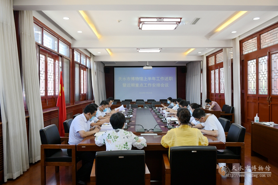 7月20日下午,天水市博物館召開2022年上半年工作述職暨近期重點安排會議。市博物館黨總支書記、館長劉玉璞主持會議并講話,黨總支副書記管玉,副館長高世華、崔文剛、張建軍及各部室負(fù)責(zé)人參加會議。