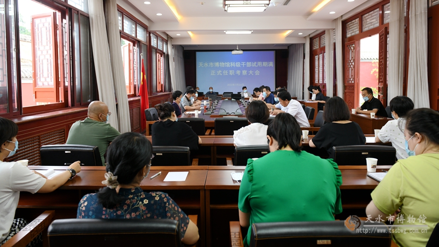 7月26日,天水市博物館在暢和軒會(huì)議室召開了“天水市博物館科級(jí)干部試用期滿正式任職考察大會(huì)”。會(huì)議對(duì)馬優(yōu)努斯、鄭文玉、鄒丹婷、雷德延4名科級(jí)干部試用期滿正式任職進(jìn)行了考察。市文化和旅游局考察組組長(zhǎng)、二級(jí)調(diào)研員魏國(guó)柱同志一行3人出席了考察大會(huì)。會(huì)議由天水市博物館黨總支書記、館長(zhǎng)劉玉璞同志主持,天水市博物館中層干部及職工代表33人參加了會(huì)議。