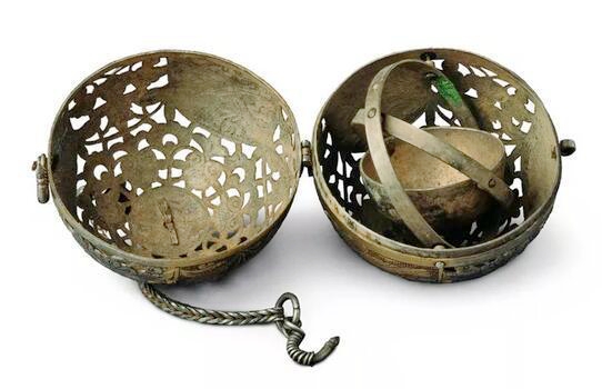 唐代所使用的香具中,專屬于上流社會(huì)貴族使用的球形香囊最為精巧,香囊由兩個(gè)半球組成,有子母口可以扣合。下半球內(nèi)裝有兩個(gè)同心圓機(jī)環(huán)和一個(gè)盛放香料的香盂。大的機(jī)環(huán)與外層球壁連接,小機(jī)環(huán)分別與大機(jī)環(huán)和香盂相連。使用時(shí),由于香盂本身的重力作用和兩個(gè)同心圓機(jī)環(huán)的機(jī)械平衡,無論香囊如何滾動(dòng),里面的香盂都可以保持水平狀態(tài),香灰不會(huì)傾撒。這種作用原理在今天的航空陀螺儀上仍在運(yùn)用,可見這種機(jī)巧的科技含量不低。香囊外殼通體透雕著精美花紋,它可不僅僅是為了美觀,香氣就是通過這些鏤空裊裊散發(fā)出來的。香囊上有鏈條,上部有彎鉤,這樣既方便佩戴在身上,也可以懸掛在室內(nèi)帳中。