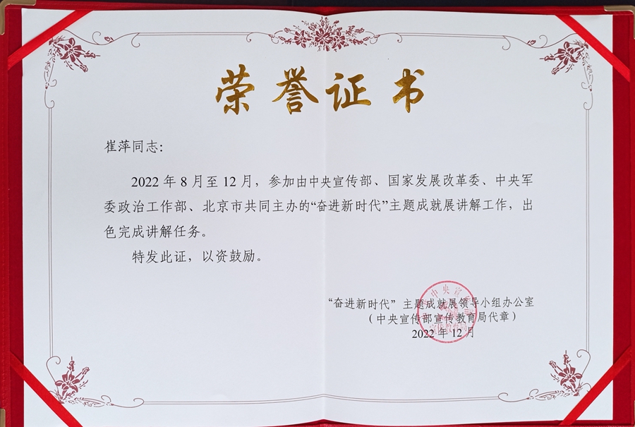 習近平總書記說:“青年強,則國家強。當代中國青年生逢其時,施展才干的舞臺無比廣闊,實現(xiàn)夢想的前景無比光明!2022年7月,經(jīng)過中宣部逐級遴選,甘肅省有5名講解員入選“奮進新時代”主題成就展中央展區(qū)講解團隊,崔萍是其中之一。從參加培訓至二十大開幕的兩個多月時間里,來自全國各地的講解員接受了緊張而充實的全方面培訓,每個人都經(jīng)過了數(shù)次深層的自我革命,獲得了自身突破。“從最初的講解培訓,到一系列的嚴格訓練和審查,近三個月的學習和實戰(zhàn)演練,引導、儀態(tài)、站姿……很慶幸這些‘挑戰(zhàn)’都被我逐一拿下!贝奁急硎。開展前講解詞前前后后經(jīng)過近二十多次的修訂,每次改動后隔天就逐一審查推演,并要求講解員在短時間內(nèi)熟練記憶并運用自如,還要主動增加展項知識的儲備,積極拓展展板兩三句描述以外的內(nèi)容,應對專家老師們“精精益求精、萬萬無一失”的考核要求。這次培訓對她不僅是一次系統(tǒng)全面的專業(yè)提升,也是非常難得的學習經(jīng)歷。經(jīng)過上百次的審查、數(shù)百次的推演和模擬練習后,講解團隊以飽滿的工作熱情和過硬的工作作風高效的服務(wù)于這次國家級高規(guī)格大型展覽,而經(jīng)過集中培訓的崔萍最終擔任中央綜合展區(qū)第十一、十二單元講解員,負責講解中國特色大國外交和全面從嚴治黨內(nèi)容。2022年10月17日晚的二十大代表專場講解工作,根據(jù)安排崔萍為甘肅代表團進行講解。“有幸為家鄉(xiāng)的代表們講解,我感到非常榮幸,接下來也會繼續(xù)完成好后面的重要接待任務(wù)。”崔萍說。整個展覽期間,崔萍圓滿完成中央領(lǐng)導同志、黨的二十大代表和列席代表、中央黨政軍群各部門黨員干部、解放軍和武警部隊官兵、各國駐華機構(gòu)負責人等重要專場接待和日常講解接待任務(wù),為“奮進新時代”主題成就展講解工作作出積極貢獻。