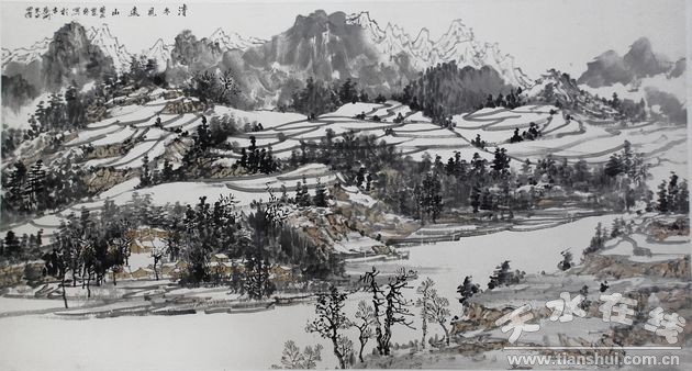 除人物畫外,近年來他主攻寫意山水,在冬雪山水畫上的探索與創(chuàng)新更是獨樹一幟,自成風格。他創(chuàng)作的冬雪山水畫視覺形式上寬厚與單純交錯,筆墨表現(xiàn)上粗狂與細潤并存,讓人感受到西部山川在冬日荒原的冰冷中所蘊藏的那股暖流,展現(xiàn)出自然生命的沉寂與壯美,在蒼茫的山水間幾棵枯樹、幾間農(nóng)舍隱約透露出些許溫情,讓人倍感親切,其筆墨技巧精良,技法語言獨成一體,大氣磅礴,富有詩意。這些都源于他作為一名土生土長的西北漢子,那歷歷在目的冬日雪景浮現(xiàn)于眼前,以至于只想借畫筆抒發(fā)熱愛故土之情,這也是他多年研習冬雪山水畫的內(nèi)在動力。