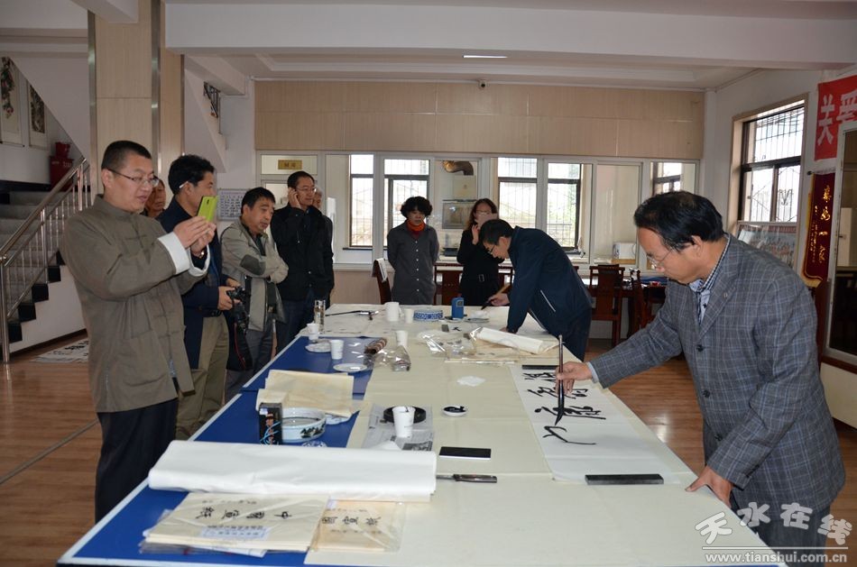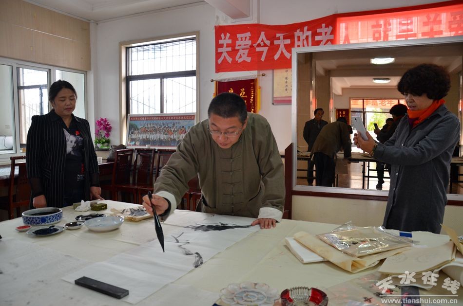 當(dāng)天上午,我市著名書畫家李靖、周宇春、劉暉、管玉、楊天霖等五位書畫家來到秦州區(qū)仁瑞福養(yǎng)老服務(wù)中心,他們首先參觀了這里的養(yǎng)老設(shè)施和養(yǎng)老服務(wù)開展情況,了解了老人們的生活起居并對這里的工作人員的辛勤勞動表示慰問。隨后,書畫家們紛紛揮毫潑墨。在近兩個小時的時間里,為老人們創(chuàng)作了幾十幅書畫作品。對老人們表達(dá)了希望他們幸福、健康、長壽的美好祝福。