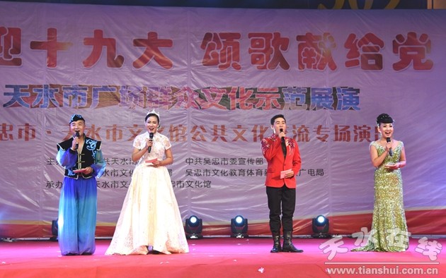 9月29日晚8:00時(shí),由中共天水市委宣傳部、中共吳忠市委宣傳部、天水市文化和旅游局、吳忠市文化教育體育新聞出版廣電局主辦,天水市文化館、吳忠市文化館承辦的“喜迎十九大 頌歌獻(xiàn)給黨”天水市廣場(chǎng)群眾文化示范展演--吳忠市、天水市文化館公共文化交流專場(chǎng)演出在天水市龍場(chǎng)廣場(chǎng)精彩上演。