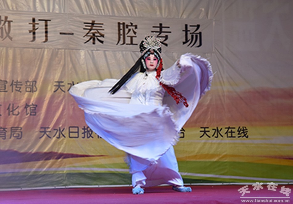 天水市西秦腔研究院、國家二級演員田芳表演的秦腔《青絲淚》拉開了本次秦腔專場演出的序幕。市西秦腔研究院優(yōu)秀男旦楊江龍表演的《斷橋》、麥積區(qū)國家三級演員劉玉敏表演的《三堂會審》以及我市青年新秀、參加央視星光大道的天水師院大學(xué)生高媛媛表演的《智取威虎山》選段贏得了觀眾熱烈的鼓掌。天水市西秦腔研究院國家著名三級演員漆金喜、黃來旺分別表演的秦腔《白逼宮》、《金沙灘》選段以及我市當(dāng)紅小生賀小慧表演的《五郎出家》,天水市西秦腔研究院、國家一級演員常小紅表演的秦腔《鬼怨》選段等相繼精彩亮相。