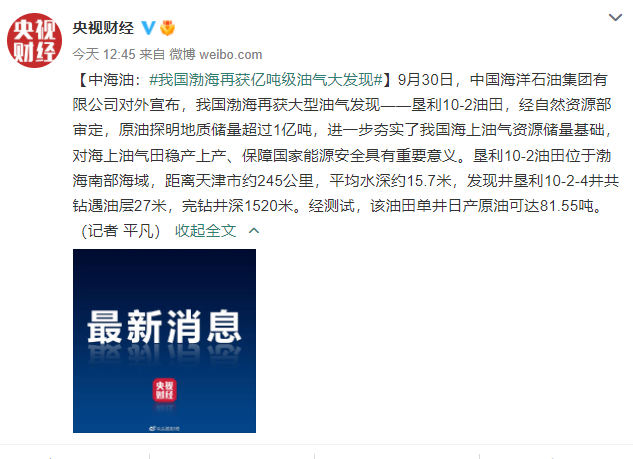 中海油:我國(guó)渤海再獲億噸級(jí)油氣大發(fā)現(xiàn)