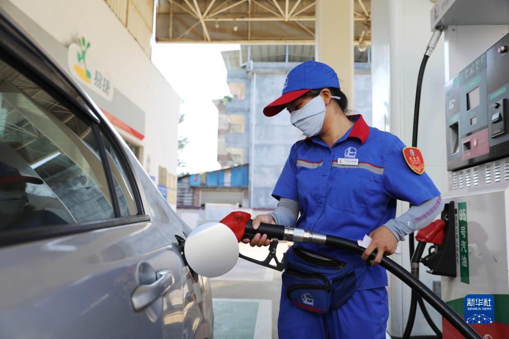 7月26日,在湖南省永州市道縣一家加油站,工作人員為汽車加油。新華社發(fā)(何紅福 攝)