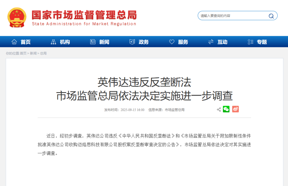 近日,經(jīng)初步調(diào)查,英偉達(dá)公司違反《中華人民共和國反壟斷法》和《市場(chǎng)監(jiān)管總局關(guān)于附加限制性條件批準(zhǔn)英偉達(dá)公司收購邁絡(luò)思科技有限公司股權(quán)案反壟斷審查決定的公告》,市場(chǎng)監(jiān)管總局依法決定對(duì)其實(shí)施進(jìn)一步調(diào)查。