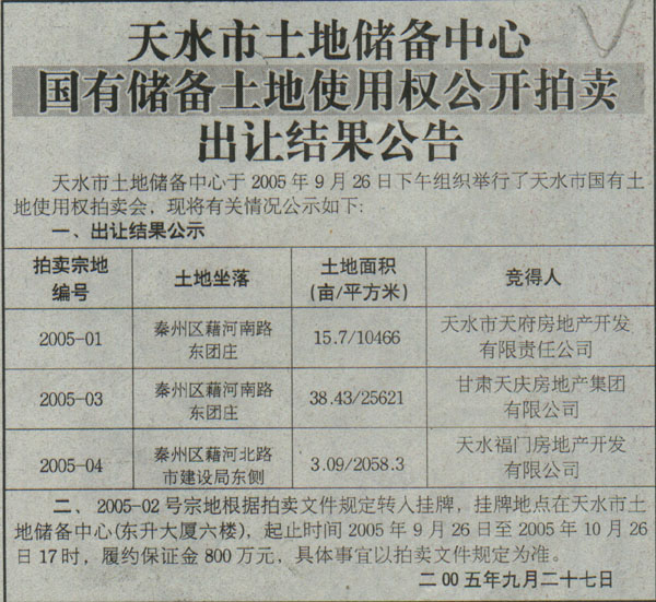 天水市土地儲(chǔ)備中心于2005年9月26日下午組織舉行了天水市國有土地使用權(quán)拍賣會(huì),現(xiàn)將有關(guān)情況公示如下: