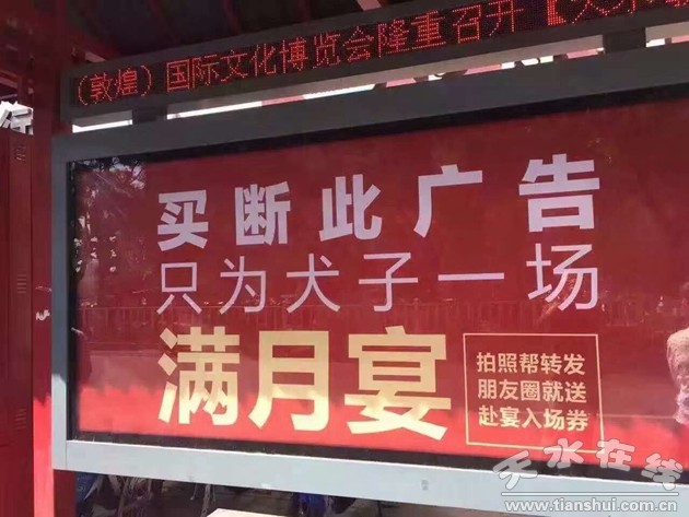 【事件回顧】9月8日一早,天水各大重要商圈廣告被一位神秘人買斷,只為給犬子辦一場滿月宴,引發(fā)全城市民的熱議,一時(shí)間刷爆了朋友圈,天水因此上了頭條。那么究竟是誰投出了這樣大手筆的廣告?是一場秀還是真有其事?在全民的猜測聲中,9月10日,神秘人意外的現(xiàn)身天水碧桂園產(chǎn)品發(fā)布會,揭曉了一切謎底!