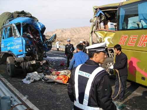 10月29日下午3時(shí)許,記者趕到樹徐高速公路2271公里+500米路段時(shí)看到,一輛由蘭州駛往金昌、車號(hào)為甘A·23319的大客車停在路中央,車左前側(cè)被“撕”開了一個(gè)大洞?蛙嚽胺绞且惠v車號(hào)為甘F·09164滿載茴香的康明斯卡車,該車前部嚴(yán)重變形。事發(fā)現(xiàn)場(chǎng)一片狼藉,地上散落著乘客們的錢包、食品、行李等物?蛙嚿系氖軅藛T已全部被送往醫(yī)院,交警正在使用道路清障車將卡車變形的車門拉開,把夾在駕駛室內(nèi)的一名死者抬出來(lái)。