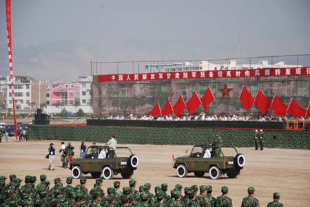 甘肅省省長(zhǎng)助理、蘭州市委副書(shū)記、市長(zhǎng)張津梁,甘肅省軍區(qū)副司令員王乃勤前來(lái)演練現(xiàn)場(chǎng)觀摩指導(dǎo),并參加了今天的轉(zhuǎn)服現(xiàn)役誓師動(dòng)員大會(huì)和閱兵式。