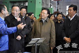 徐守盛強調(diào),要在轉(zhuǎn)變發(fā)展方式上實現(xiàn)新突破。要加快產(chǎn)業(yè)優(yōu)化升級,加大企業(yè)改革兼并重組力度,實現(xiàn)產(chǎn)權(quán)多元化。大力培育發(fā)展新能源、有色金屬新材料、精細(xì)化工、生物制藥、航空航天等戰(zhàn)略性新興產(chǎn)業(yè),搶占經(jīng)濟發(fā)展的制高點。大力發(fā)展循環(huán)經(jīng)濟,探索建立循環(huán)農(nóng)業(yè)為基礎(chǔ),循環(huán)工業(yè)為主體,循環(huán)社會為補充的循環(huán)經(jīng)濟體系。加快發(fā)展現(xiàn)代服務(wù)業(yè),努力提高服務(wù)業(yè)在經(jīng)濟總量中的比重。促進中小企業(yè)非公經(jīng)濟加快發(fā)展,形成產(chǎn)業(yè)集聚和企業(yè)集群。