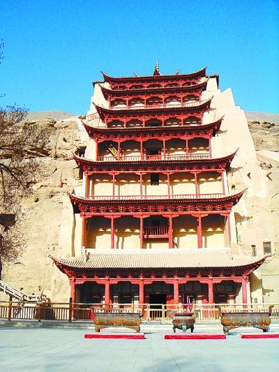第96窟是莫高窟最高的一座洞窟,其外附巖而建的“九層樓”是莫高窟的標(biāo)志性建筑。這座窟檐在唐文德元年(888年)以前就已存在,當(dāng)時(shí)為5層,北宋乾德四年(966年)和清代都進(jìn)行了重建,并改為4層。1935年再次重修,形成現(xiàn)在的9層造型。