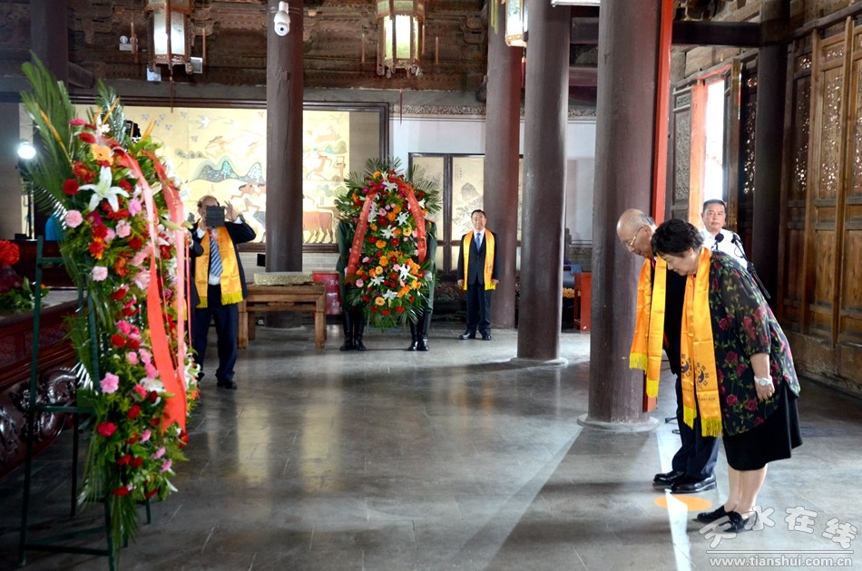 (中國(guó)國(guó)民黨前主席吳伯雄及夫人戴美玉向伏羲圣像敬獻(xiàn)花籃)