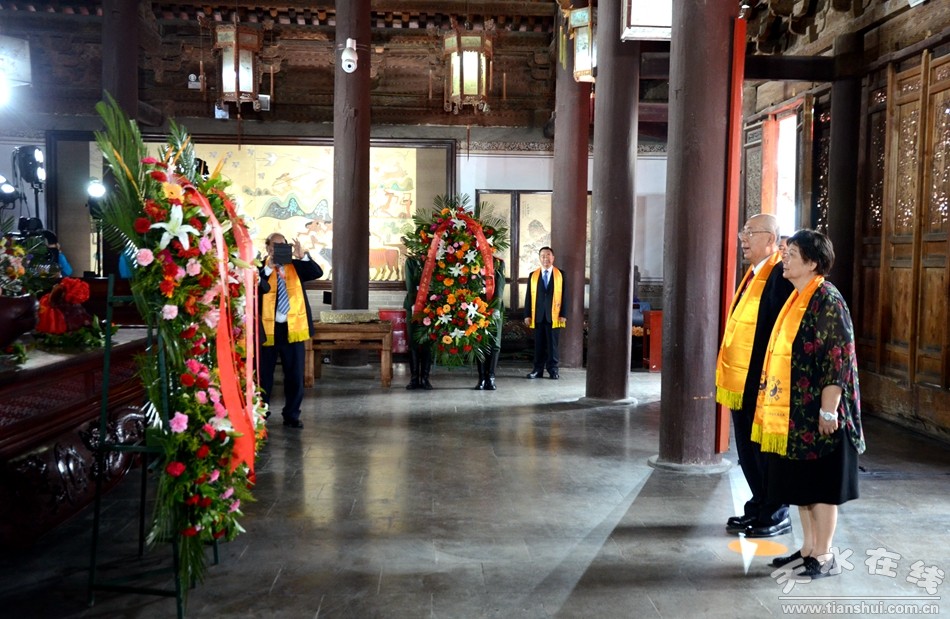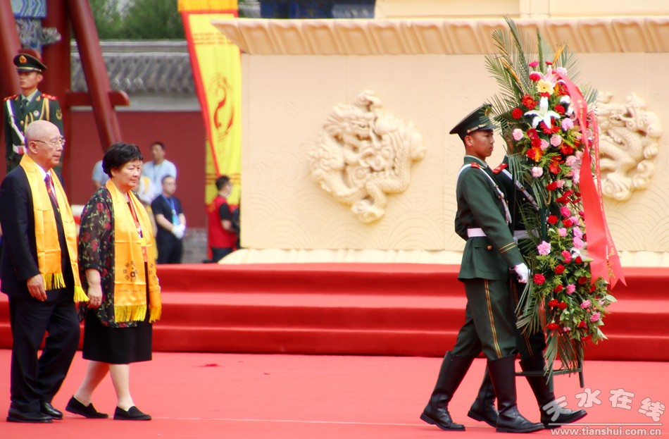 (中國(guó)國(guó)民黨前主席吳伯雄及夫人戴美玉向伏羲圣像敬獻(xiàn)花籃) |