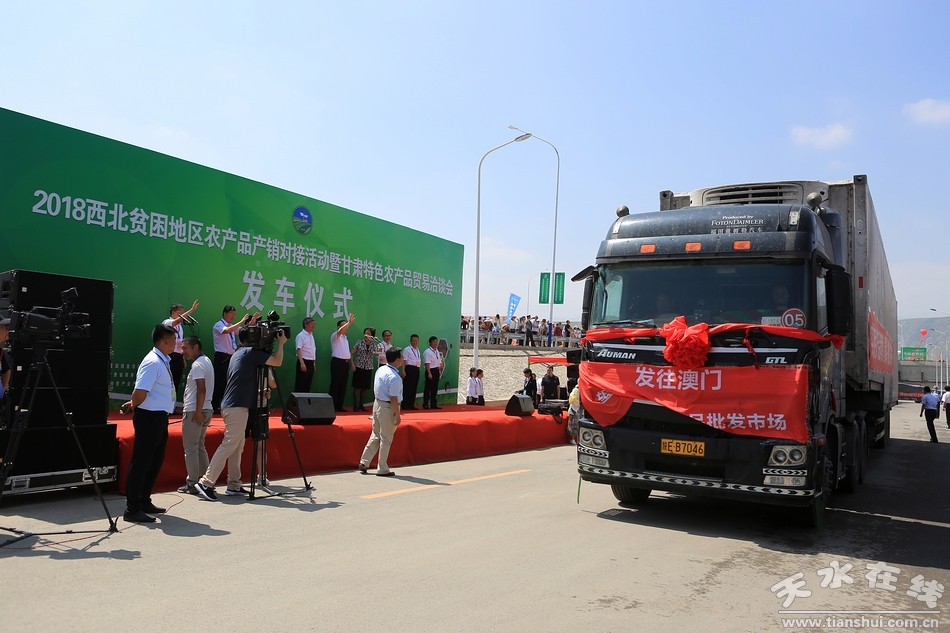 今天的活動現(xiàn)場,隨著一聲發(fā)令槍響,我省70輛滿載特色農(nóng)產(chǎn)品的大卡車徐徐駛出甘肅省特色農(nóng)產(chǎn)品交易中心蔬菜區(qū),發(fā)往新加坡、馬來西亞、菲律賓等國,以及香港、澳門和長三角、珠三角、京津、成渝等地區(qū)的國內(nèi)各大終端市場。此次外銷的特色農(nóng)產(chǎn)品主要包括菜花、西藍(lán)花、西芹、娃娃菜、散花、青筍、馬鈴薯、洋蔥、牛奶、豬肉等10多個大宗品種。