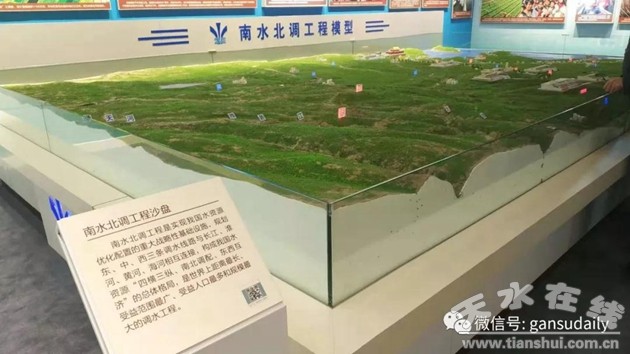 在“水利設(shè)施建設(shè)”中,展示了南水北調(diào)工程沙盤,這是世界上距離最長、受益范圍最廣、受益人口最多和規(guī)模最大的調(diào)水工程,小每妹在沙盤上看到了蘭州市。