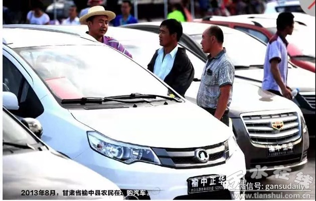 “壯美篇章”第一單元“希望的田野”,突出反映了農(nóng)業(yè)改革波瀾壯闊的偉大實踐,農(nóng)業(yè)生產(chǎn)、農(nóng)民生活、農(nóng)村面貌發(fā)生的巨大變化。其中一張圖片展現(xiàn)的是“2013年8月,甘肅省榆中縣農(nóng)民在選購汽車”。
