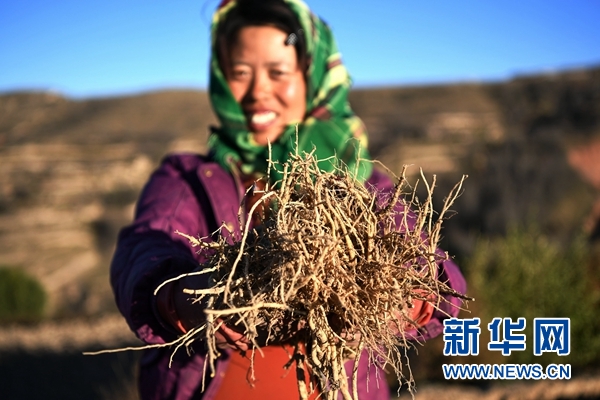 在甘肅省定西市渭源縣新寨鎮(zhèn)三合村,藥農(nóng)趙金霞展示剛從地里挖出來(lái)的黨參。新華社記者 陳斌 攝(資料圖片)