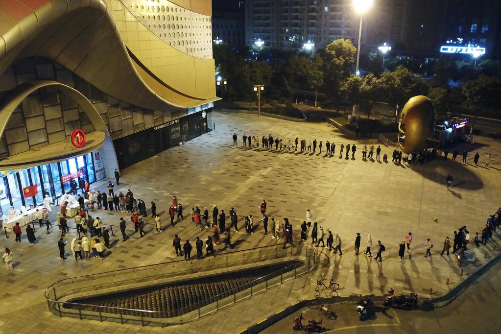 10月21日凌晨,在蘭州市城關(guān)區(qū)天水路一核酸檢測采樣點(diǎn),市民有序排隊(duì)等待。(無人機(jī)照片) 新華社記者范培珅 攝
