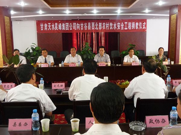 捐款儀式上,昊峰集團(tuán)公司董事長程俊峰作了講話,并代表公司給甘谷縣西北部農(nóng)村飲水安全工程捐款100萬元,甘谷縣委書記王子生代表縣上四大組織作了熱情洋溢的講話,副縣長申君明代表縣委、縣政府接受了昊峰集團(tuán)的捐贈。