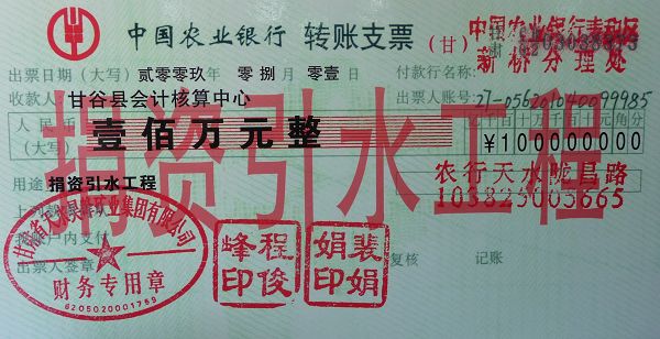 西北部農(nóng)村飲水安全工程捐款100萬元