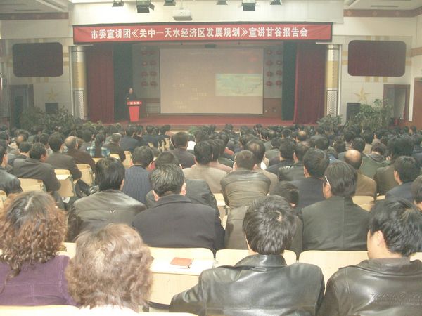 3月12日下午,天水市委《關(guān)中—天水經(jīng)濟區(qū)發(fā)展規(guī)劃》宣講團一行,深入甘谷縣舉行宣講報告?h委書記王子生,縣人大主任劉元映,縣政協(xié)主席王璽卿等縣四大組織在家領(lǐng)導(dǎo),各鄉(xiāng)鎮(zhèn)黨委書記、鄉(xiāng)鎮(zhèn)長、人大主席,縣直各部門、駐縣各單位副科級以上干部,城區(qū)中小學(xué)校長,各村黨支部書記和村干部在甘谷一中多功能廳聆聽了宣講報告。