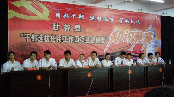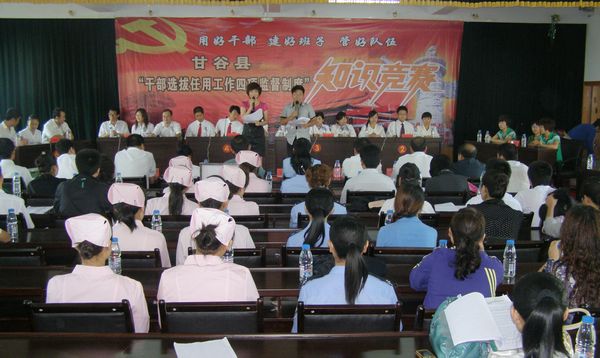 為了檢驗和強化干部選拔任用工作政策法規(guī)集中宣傳教育成果,深化“干部選拔任用工作條例和四項監(jiān)督辦法”的宣傳學習,推動各級黨組織和廣大黨員干部更好地貫徹執(zhí)行干部選拔任用工作政策法規(guī),促進全縣創(chuàng)先爭優(yōu)活動深入開展。8月26日,甘谷縣舉辦“干部選拔任用工作四項監(jiān)督制度”知識競賽。