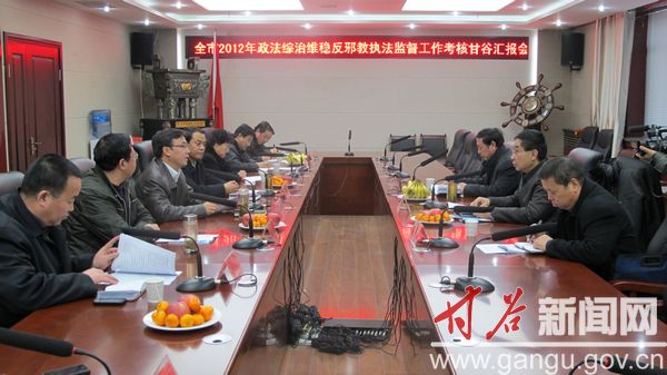 12月18日,市委政法委常務(wù)副書記陳明達(dá)帶領(lǐng)市政法綜治維穩(wěn)考核組,就甘谷縣2012年度政法綜治維穩(wěn)工作完成情況進(jìn)行了全面考核?h委常委、常務(wù)副縣長李尚平,縣委常委、政法委書記邵宏偉,縣人大副主任魏慶英,縣政協(xié)副主席陳旭及相關(guān)部門負(fù)責(zé)人陪同考核。
