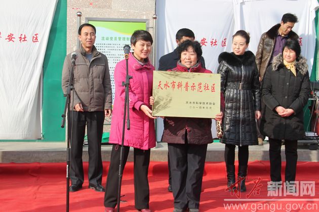 活動儀式上,縣委常委、宣傳部長董珺向磐安鎮(zhèn)社區(qū)頒發(fā)了“天水市科普示范社區(qū)”的榮譽(yù)稱號。 縣委宣傳部、縣文廣局、縣科技局、縣衛(wèi)生局、磐安鎮(zhèn)社區(qū)等單位的工作人員,在現(xiàn)場進(jìn)行了文藝演出、寫春聯(lián)、免費(fèi)義診、散發(fā)科普宣傳、提供法律咨詢、農(nóng)業(yè)技術(shù)推廣咨詢等幾十項(xiàng)惠民服務(wù)。