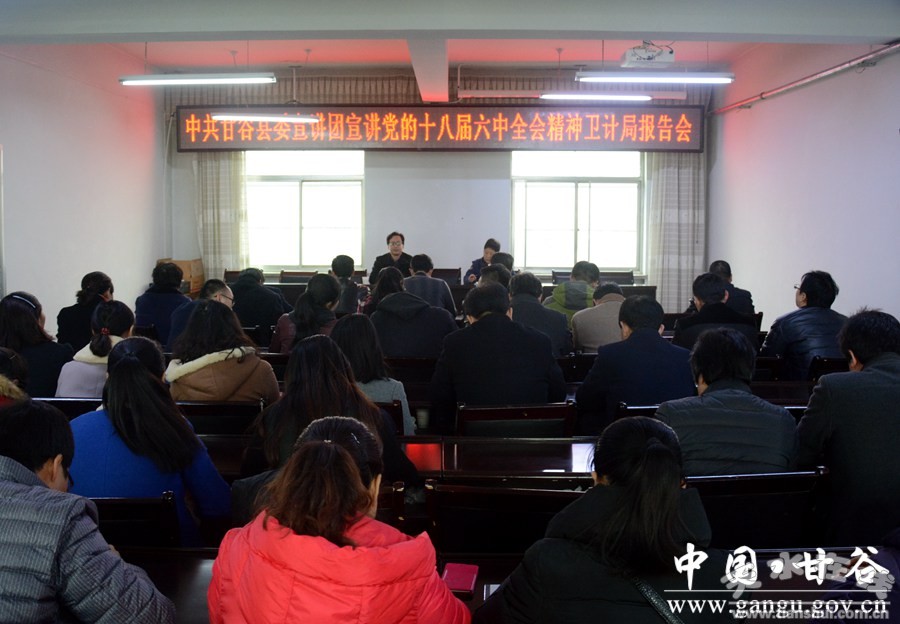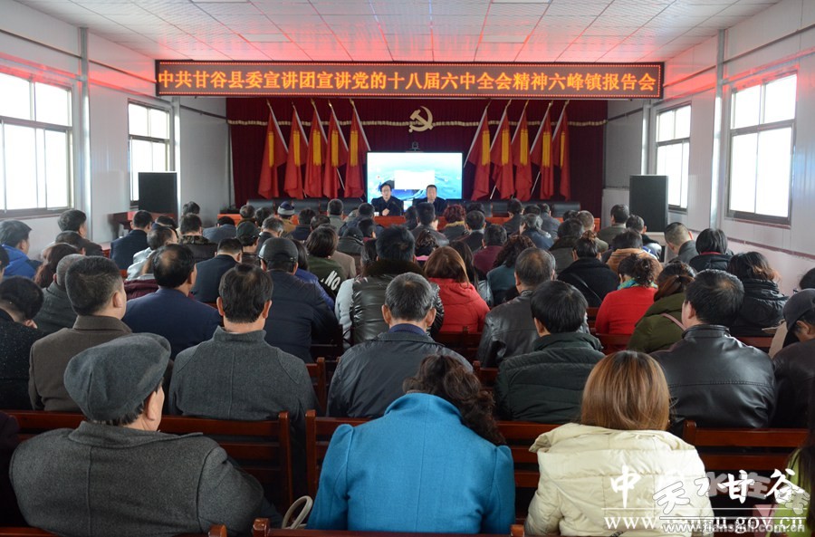 為深入學(xué)習(xí)宣傳貫徹黨的十八屆六中全會(huì)精神,按照中央和省市縣委總體部署要求,11月22日,甘谷縣委宣講團(tuán)深入六峰鎮(zhèn)宣講黨的十八屆六中全會(huì)精神,鎮(zhèn)村兩級(jí)干部共計(jì)100多人聆聽報(bào)告。